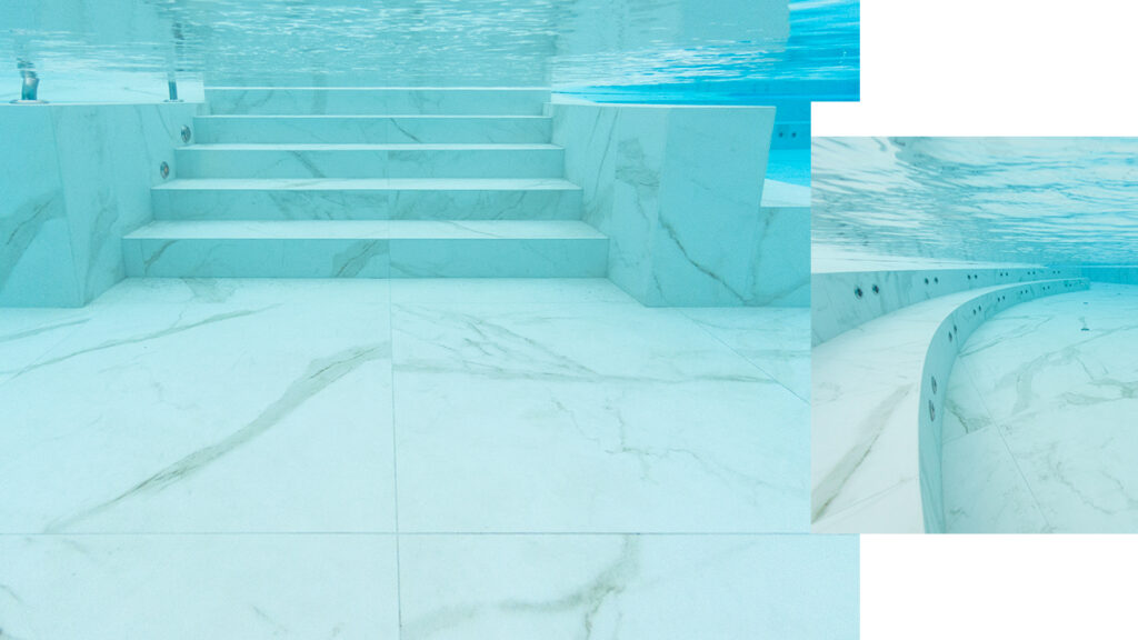 And finally, the freedom and lack of limits (in reasonable common sense!) with which Laminam surfaces can be experienced: leisurely barefoot walks around the pool, professional dives, and dives by young swimmers ready to challenge themselves to touch the bottom…