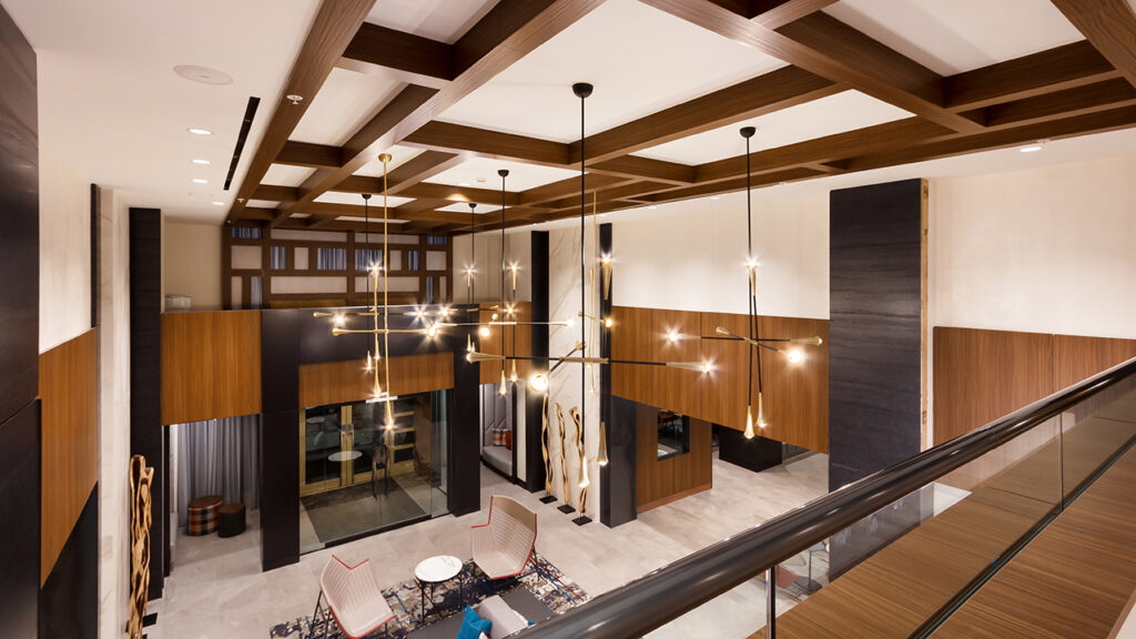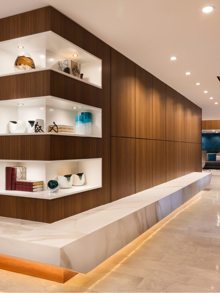 Hartman Design Group opted for Laminam I Naturali – Calacatta Oro Venato surfaces to cover a visually stunning double-height interior wall next to the entrance, the rear walls of reception, thus bringing a look of great formal refinement and elegance to the area, a door – for a ‘total look’ version of the Laminam Effect approach – fitted within the same walls that define it, the walls of the lift lobby, and lastly, a custom cantilever bench.