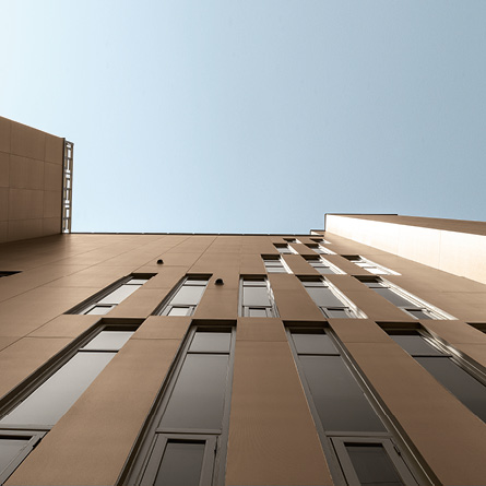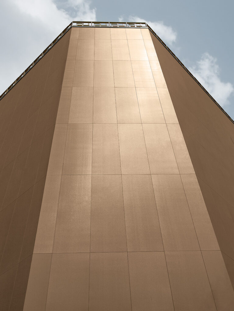 Filo stands out for its stunning texture, inspired by the image of an endlessly recurring iridescent thread, interwoven so that it blends seamlessly into a metallic fabric. The Rame colour used to cover the ventilated façade is a clear reference to the colour gold, a precious metal and, according to Buddhist philosophy, packed with spiritual power.