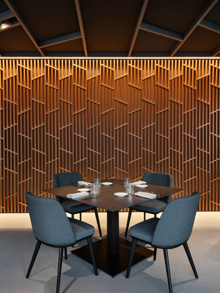 The practical and essential interior areas are embellished with decorative wall elements vaguely inspired by the Japanese calligraphic tradition with optical contaminations. Three-dimensional effects punctuate the visual composition of the space, leading along a zig-zag path that accompanies guests through the rooms. In the restaurant room, the large-sized Pietra Piasentina flooring counteracts with the sound-absorbing false ceiling in a ‘coffered’ design, expressing a visual contrast that enhances the elements reciprocally.