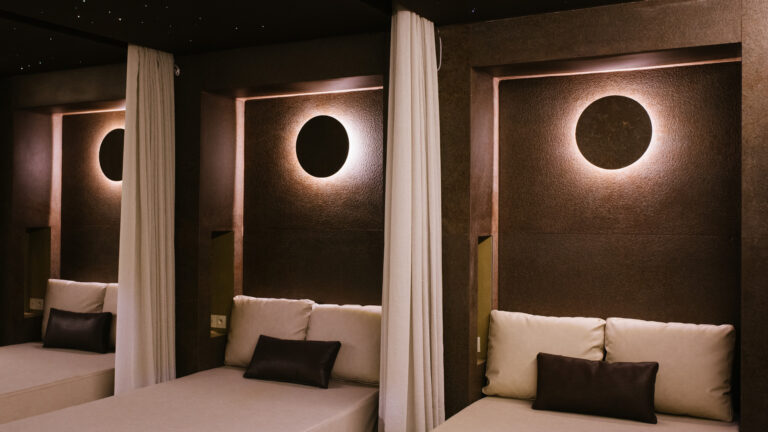 The extra-large size ceramic slabs create a striking seamless surface in the rooms and common areas. The Ya Amar Suite is furnished with floors and walls in Calacatta Oro Venato Polished, chosen in large 1000×3000 mm slabs: an ivory-white horizon crossed by prominent veins turning from brown to gold and continuing uninterrupted on the floor and along the entire wall of the room. From the suite to the wellness center, from white to black: even for the wellness area, it is the clear vein of Noir Desir that attracts the eye as it runs across the large 1620×3240 mm slabs of the walls and floor.
