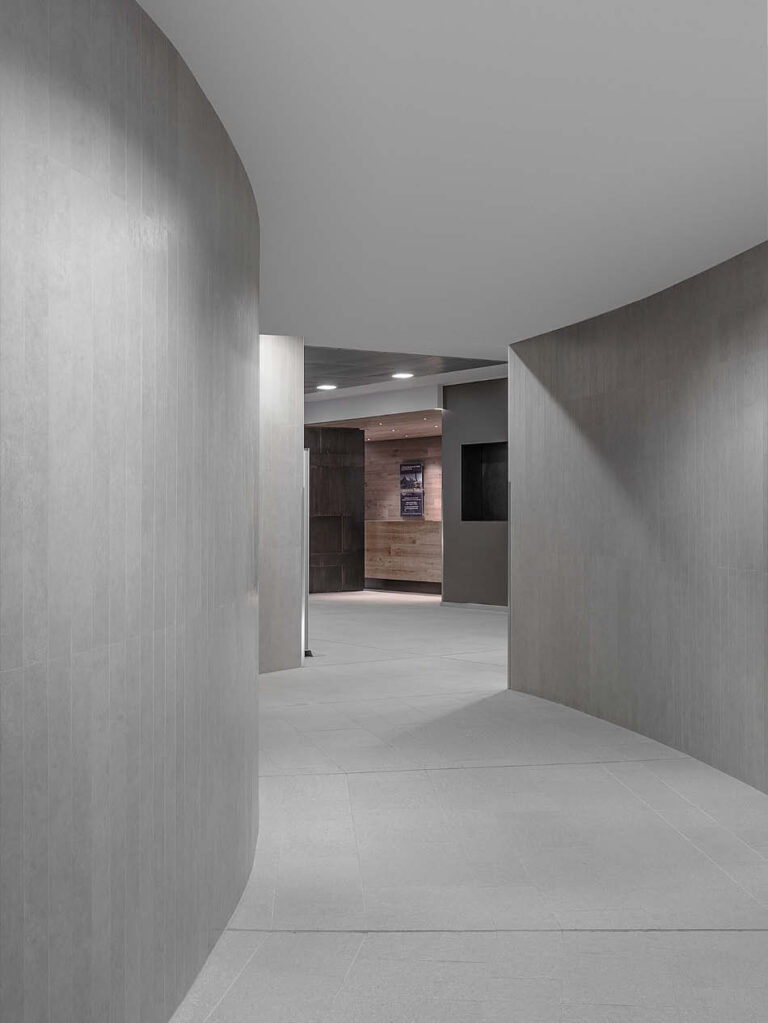 The Laminam ceramic slabs have been cut into modules, in order to adapt to the sinuous and wrap-around curvilinear walls that distinguish the SkyWay Montebianco interiors.
