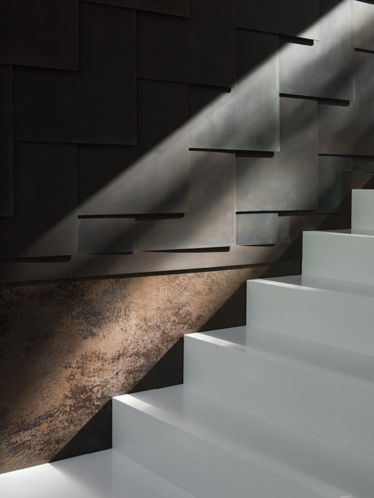 The countryside in which the house is set has influenced both the choice of structure and the materials used. Two volumes overlap with the main one that serves as a base, the rectangular floor of which houses the living area and a well-being space occupied largely by an indoor pool. Climbing the stairs, we reach the first floor with its living room and large kitchen, while the bedrooms are found on the second floor. On the outside, the materials used for the cladding combine to create overlapping and contrasting effects. Large sized oxidised metal-effect Laminam ceramic slabs from the Oxide collection, with the Moro finish, are used as the base.