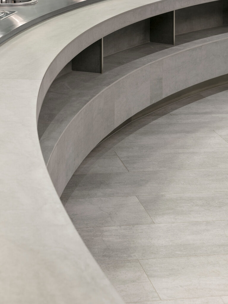 The dining room of the Telekom headquarters is in fact devised like a harmonious space where an array of different materials and hues co-exist and blend together. The wood of the parquet flooring embraces a beating heart featuring gentle shades of Laminam ceramic slabs. Both materials are totally natural, and they distinguish chromatically the area where meals are eaten from the central area where they are instead prepared. The material used continuously, from the flooring to the semi-circular shaped desk, and from the work surface to the vertical claddings of the cabinet, is the porcelain stoneware of Laminam ceramic slabs, chosen in the series which by no accident happens to be I Naturali, in the Pietra di Savoia Grigia Bocciardata finish. Natural in both the composition of the material as well as the surface appearance, which resembles genuine stone in every possible way.
