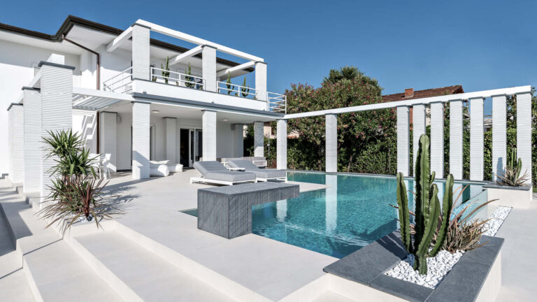Laminam, the skin for architecture and design, is synonymous with hard-wearing and recognisable surface. Laminam slab is not just a design element; it can become the unique material with which to functionally decorate and clad any space. It was with this approach that Michele Vitaloni, Interior Designer at Charmitaliastudio, conceived and developed the internal and external restyling of Villa Due in Forte dei Marmi. The clean lines and pure, functional design make for a rational style that is also aesthetically pleasing, a distinctive mark of the Studio that finds expression in the choice of cladding materials.