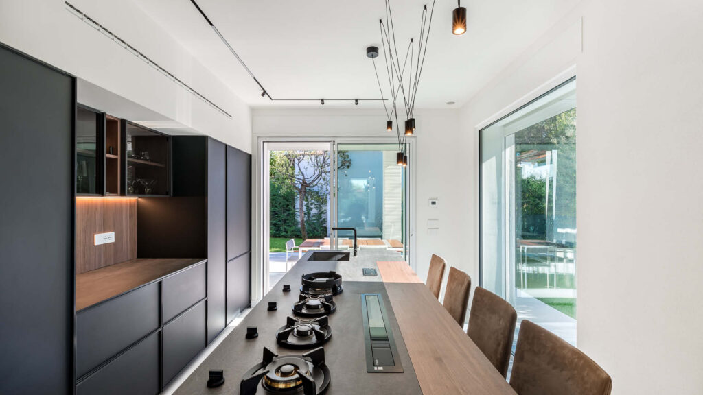 For Villa Anna a kitchen has been designed with clean lines and light colors contrasted with the dark color of the countertop with integrated sink, made with Pietra di Savoia Antracite Bocciardata, which makes it elegant and functional and it is enriched by a long rectangular section of the kitchen island in Canaletto walnut wood. The natural materials and Laminam surfaces are therefore mixed to create a clean but warm environment, designed in harmony.