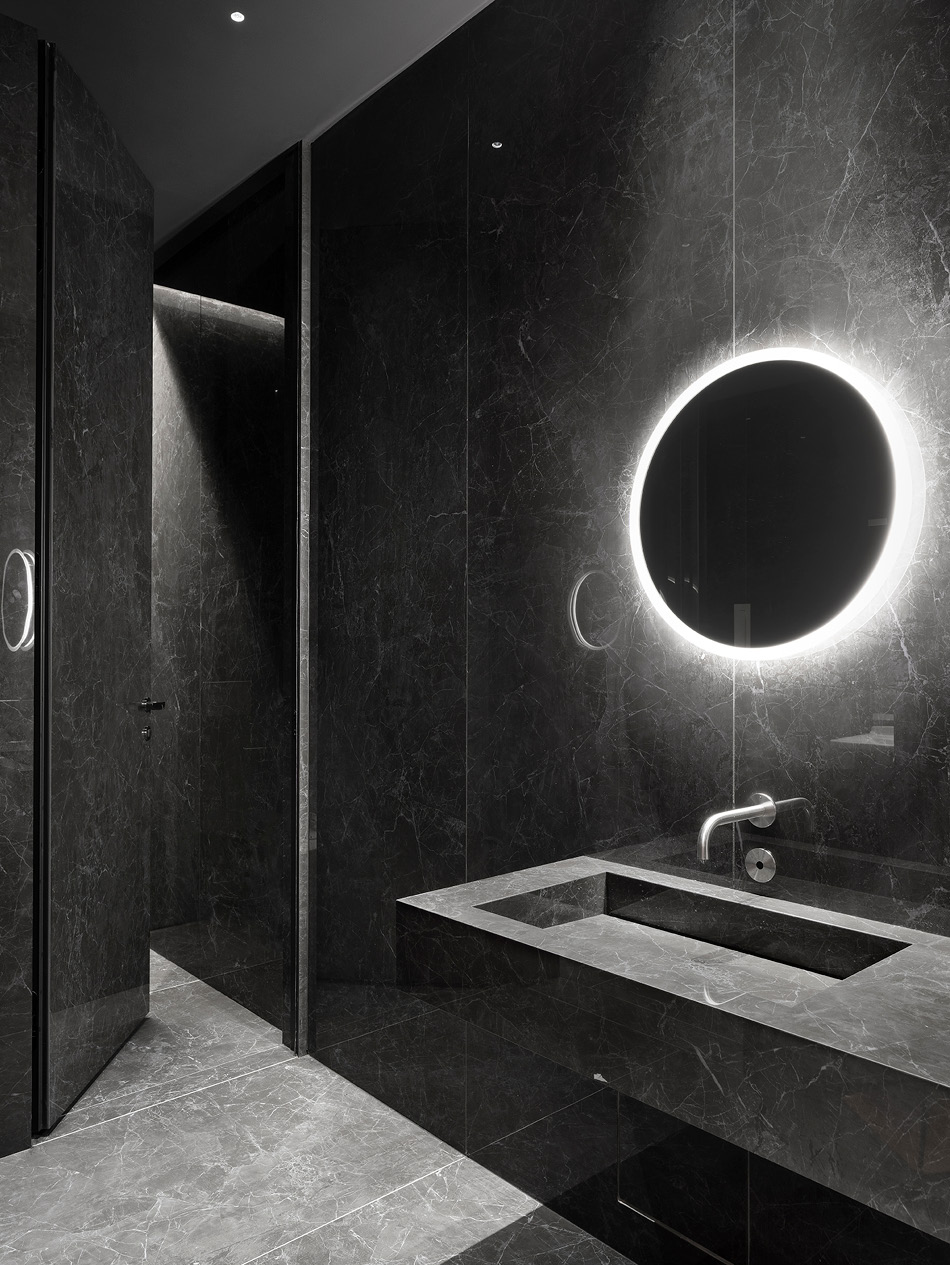 Troviamo ancora la materia ceramica Laminam nella zona bar, con le grandi lastre in Pietra Piasentina Grigio Fiammato 1200 x 3000 mm e spessore Laminam 5+ applicate a rivestimento del backsplash nello spazio adibito alla preparazione dei drink. I bagni in Laminam Nero Greco della collezione I Naturali chiudono il progetto, concorrendo a sottolineare la misurata palette cromatica giocata su una studiata alternanza delle tonalità dei grigi e sul contrappunto armonico del legno naturale e degli elementi tridimensionali arancioni a parete.