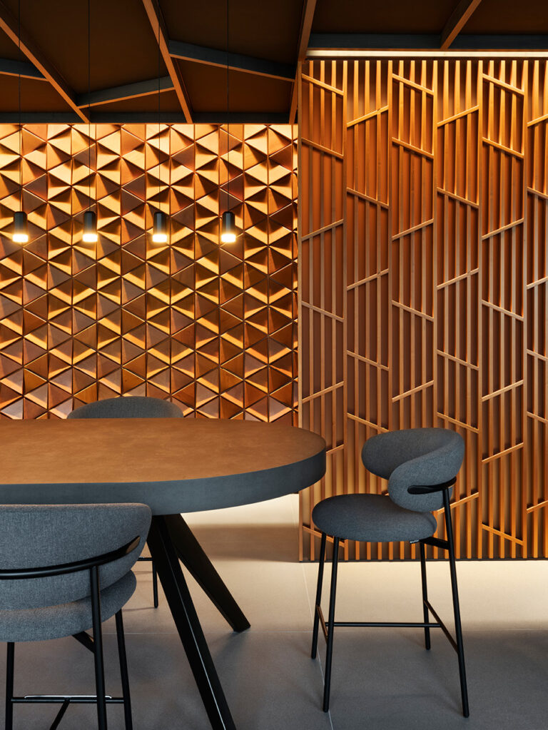 Entrando nel locale, emergono la personalità e la praticità con cui l’Architetto Maffei ha progettato gli spazi, selezionando componenti funzionali e di grande valore estetico per arredare “DaV Milano”, arricchendolo senza appesantirlo. Le aree interne, pratiche ed essenziali, sono impreziosite da elementi decorativi a parete vagamente ispirati alla tradizione calligrafica giapponese con contaminazioni optical. Gli effetti tridimensionali scandiscono la composizione visiva dello spazio, guidando lungo un percorso a zig-zag che accompagna gli ospiti attraverso gli ambienti. Nella sala del ristorante la pavimentazione in Pietra Piasentina di grande formato dialoga con il controsoffitto fonoassorbente su disegno a ‘cassettoni’, esplicitando una contrapposizione visiva che valorizza reciprocamente gli elementi.