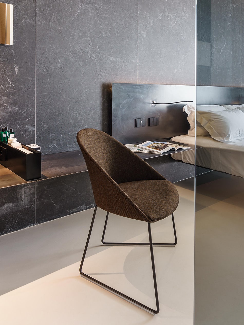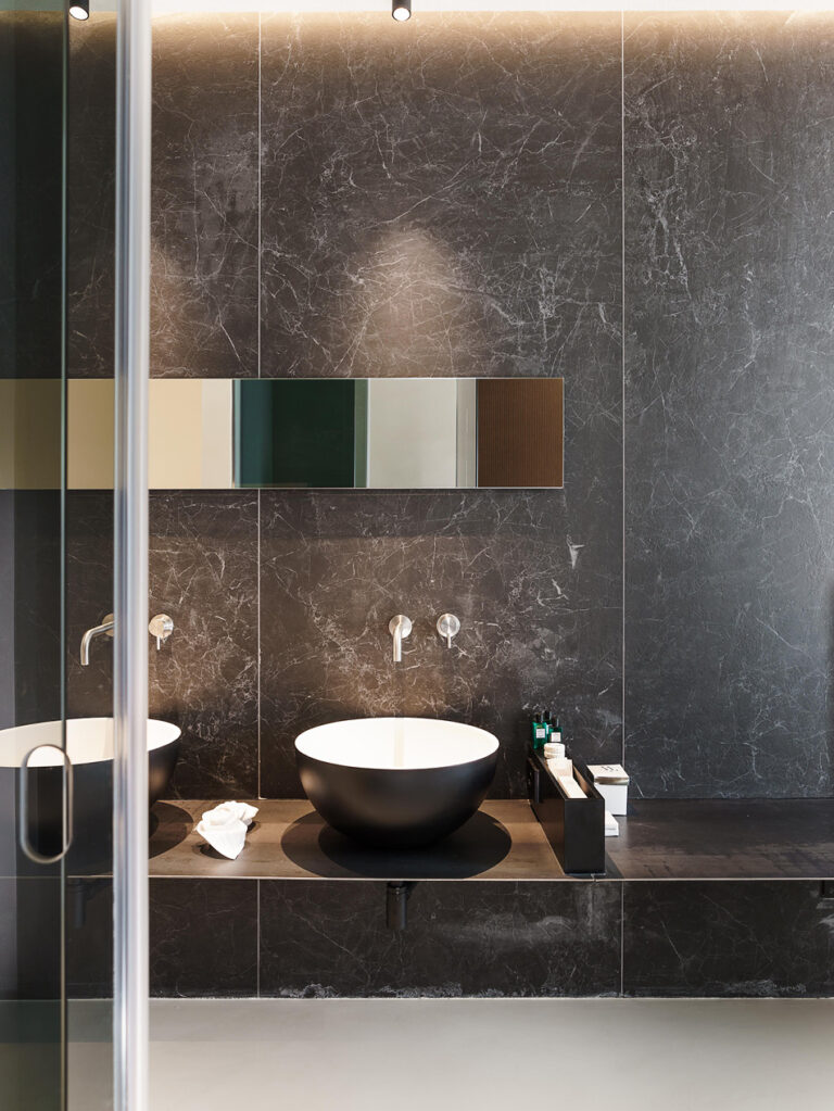 Questo obiettivo è stato raggiunto anche grazie alla varietà di texture, colori, dimensioni e spessori delle lastre Laminam impiegate che hanno reso possibile una continuità espressiva totale. Applicate in particolare nelle pareti delle testate dei letti e nei bagni delle suites, le lastre Laminam della serie I Naturali, Calce ma anche Seta arricchiscono il design dei rivestimenti in una logica di Laminam Effect strabiliante.