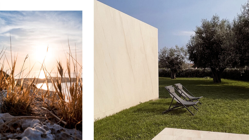Le striature riprodotte sulle grandi lastre Laminam richiamano poi l’effetto della salsedine sulle superfici. E il tetto è dello stesso colore, e questo determina una ulteriore continuità valorizzando la finitura. Progettare nel e con il paesaggio non vuol dire