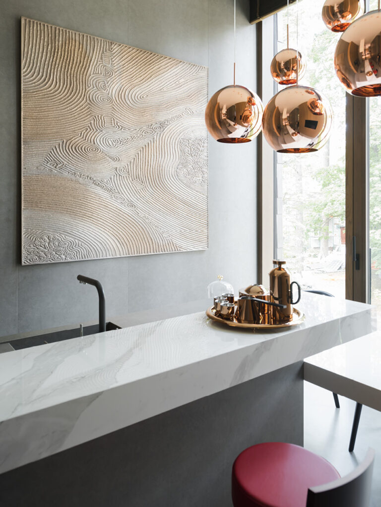Anche all’interno l’architetto ha inteso dare movimento agli spazi intrecciando materiali e colori perfettamente intonati tra loro, dando un effetto di continuità tra esterno e interno. Le lastre ceramiche Oxide sono state utilizzate anche nei rivestimenti interni delle scale e dell’area piscina mentre nella zona living e in cucina, si trovano le lastre ceramiche della collezione I Naturali, Pietra di Savoia Grigia Bocciardata dai pavimenti ai rivestimenti verticali (presenti anche nel cancello esterno) mentre il Bianco Statuario Venato è stato impiegato nei piani orizzontali della cucina. La scelta delle lastre ceramiche è nell’ottica del rispetto per l’ambiente e della ricerca di un prodotto di estrema durabilità. Da un lato, l’ecocompatibilità della ceramica Laminam e la sua composizione di materie prime naturali è un valore aggiunto per un paesaggio come quello che circonda la casa, dall’altra le elevate resistenze alle sollecitazioni esterne, ai raggi UV e alle escursioni termiche rendono questo materiale ideale per l’uso in edilizia.