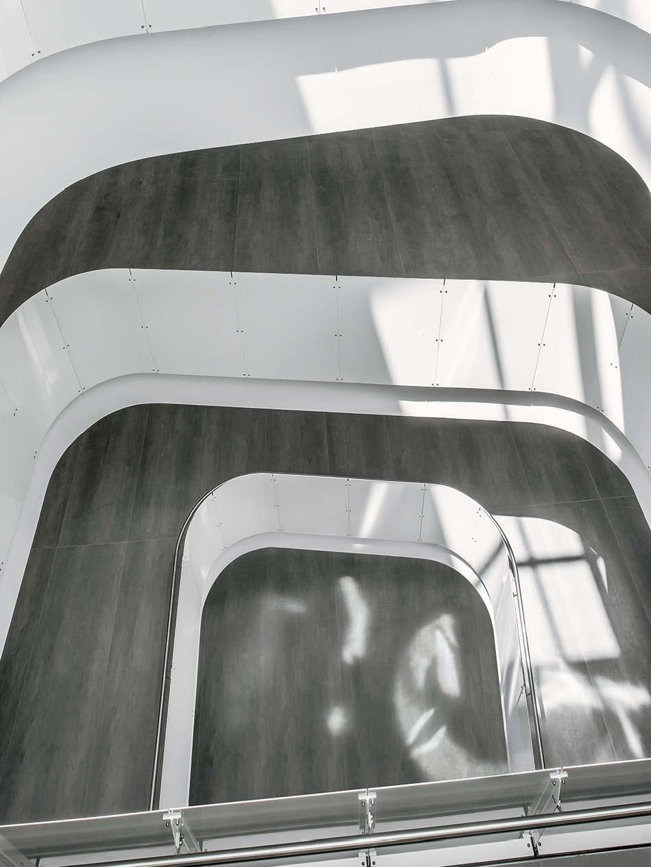 Per la pavimentazione del complesso universitario è stata scelta la collezione I Naturali Pietre nella finitura Pietra di Savoia Grigia con formato 1000x3000mm spessore 5,6 mm, che riproduce fedelmente l’essenza tecnica ed estetica del materiale naturale da cui trae ispirazione rivelando texture ad alto valore tecnologico. Le sue superfici fluide e sorprendentemente strutturate creano un forte effetto di coerenza e continuità fondendo gli spazi tra loro e rafforzando così quel senso di unione e condivisione che informa tutto il progetto. La luce solare che investe gli spazi attraverso le ampie finestre e il lucernario centrale dell’edificio, si riflette sulla pavimentazione donando un senso di grande luminosità e sottolineando l’effetto naturale delle superfici ceramiche.