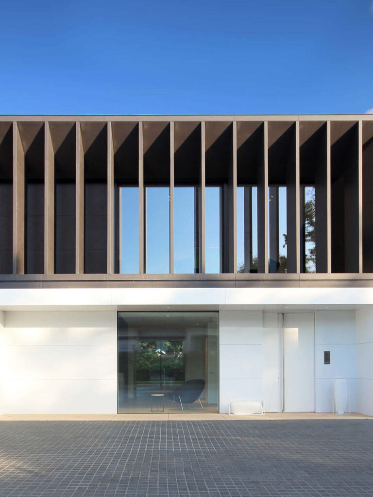 Come spiega lo stesso architetto, “una composizione di sottili cornici nere e bianche articola i pieni e i vuoti dei due livelli esterni, mentre una serie di patii bianchi scavati porta aria e luce naturale al livello interrato. Le cornici, ciascuna corrispondente ad uno specifico spazio interno, sono rivestite con lastre ceramiche nere di Laminam e pannelli in alluminio bianco montati su un sistema di facciata ventilata”.