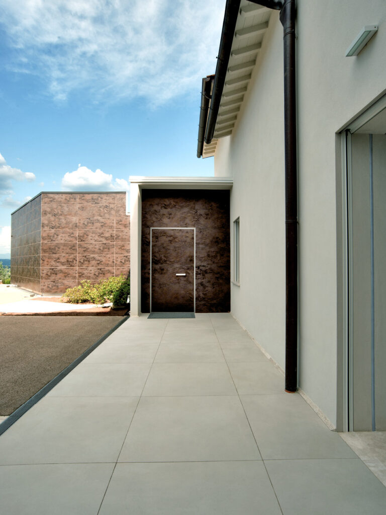 La casa privata in provincia di Firenze, immersa nel verde delle colline toscane, combina la struttura tradizionale con soluzioni moderne utilizzate per il rivestimento di parte della facciata e delle porte esterne. Oxide, scelto nella finitura Moro, è utilizzato negli esterni per mettere in evidenza l’effetto di tridimensionalità superficiale che la texture effetto metallo ossidato offre reagendo alla luce solare.