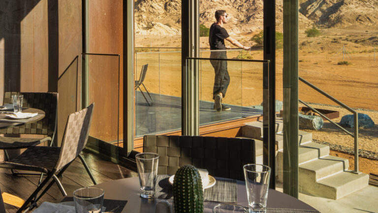 Starting from these considerations, Jonathan Ashmore partially clad the boutique hotel’s outside walls with CorTen oxidised steel. The secondary structural materials were aluminium and hardwoods like teak, particularly for overhanging roofs, shading elements and raised terraces overlooking the dunes. In addition to plastered parts of the walls, these solutions add elegance and precision to the project, give the buildings a soft change of colour and texture designed to mature and change in response to the climate.