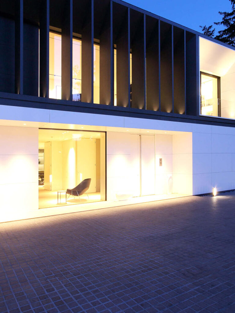 As the architect himself explains, “a composition of black and white thin frames articulates the solids and voids of the two levels above ground, while a series of white sunken patios brings air and natural light to the basement level. The frames, each corresponding to a specific interior space, are clad in black ceramic slabs by Laminam and white aluminum panels on a ventilated façade system”.