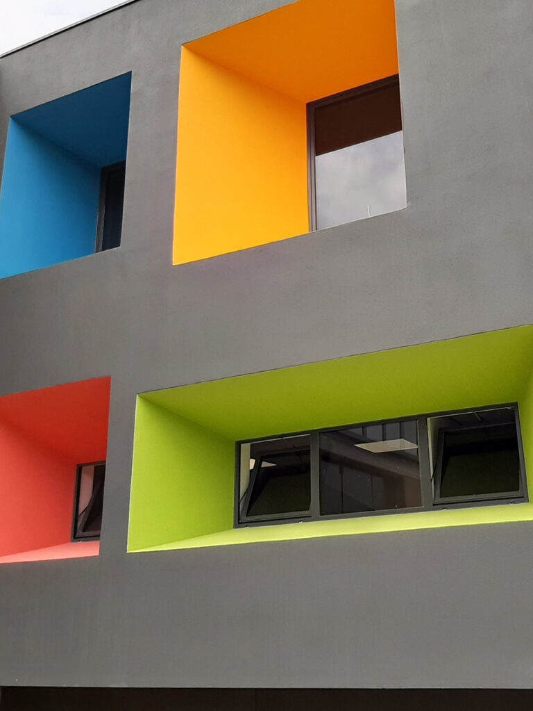 From a formal point of view, the metal structure completely interrupts the existing one and allows the upper part of the building to overhang, forming flared and irregular shapes where there were originally simple windows. Different materials and finishes can be applied thanks to its large extension, to further emphasise the idea of dynamism already suggested by colour matching.