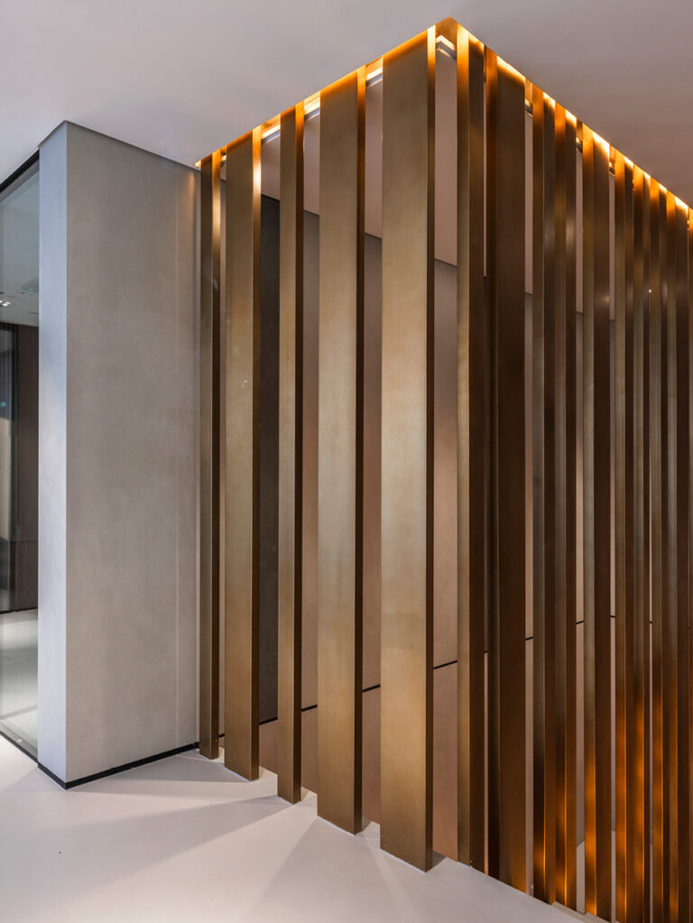 The Pininfarina Architecture team aimed to create a building, where the interior space seamlessly continues the exterior. Thus, the main Lobby design theme became the rhythm created by two tints, Grigio and Antracite, of Laminam ceramic slabs of the Calce Series.