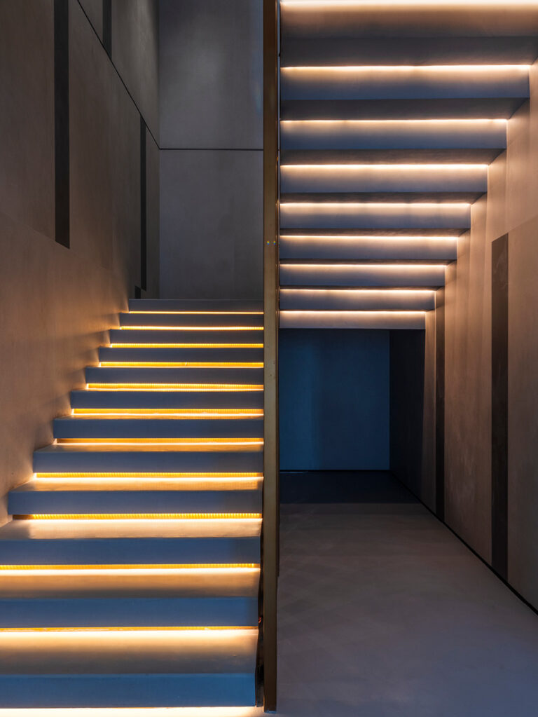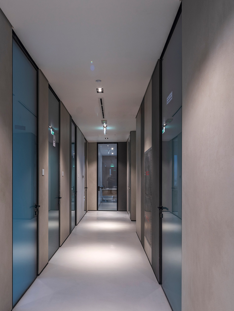 The team selected this series, inspired by wet plaster and industrial concrete, because it perfectly creates a dialogue with the exterior concrete panels and has soft tone colours and delicate nuances that allowed the team to create this particular rhythm.