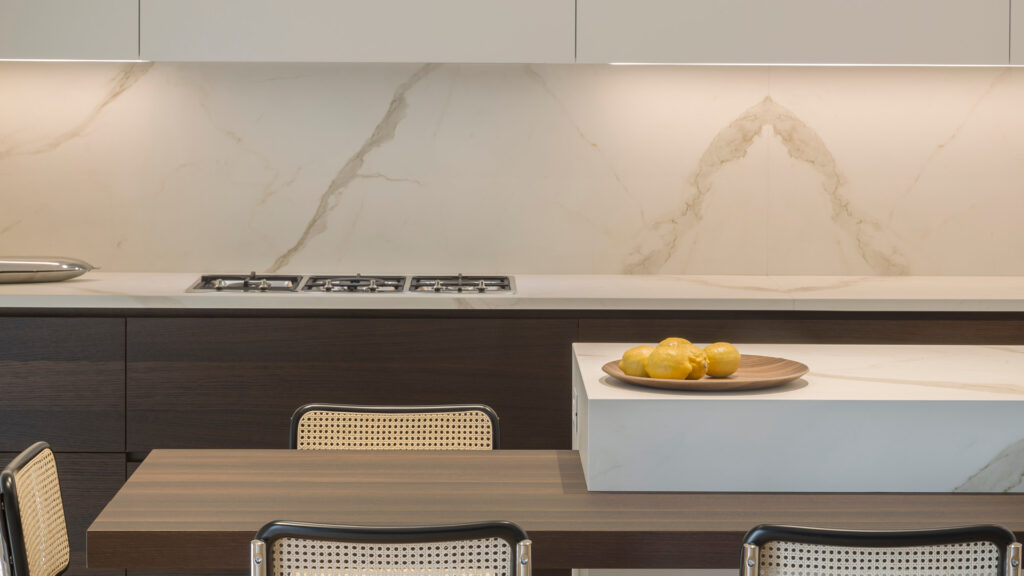 The careful choice of finishes for the living area and the kitchen environment resulted in the use of Laminam ceramic slabs. A large wall in Calce Nero, engraved with slats, acted as a backdrop, hiding a glass door that opened to a view of the handcrafted kitchen. The central island is made of Calacatta Oro Venato in a Book Match composition. Its monolithic aesthetic is interrupted by the insertion of an oak shelf that transforms it into a cantilever table. Natural wood meets the Laminam ceramic material’s aesthetics and excellent properties which was also chosen for the worktop and the integrated sink.