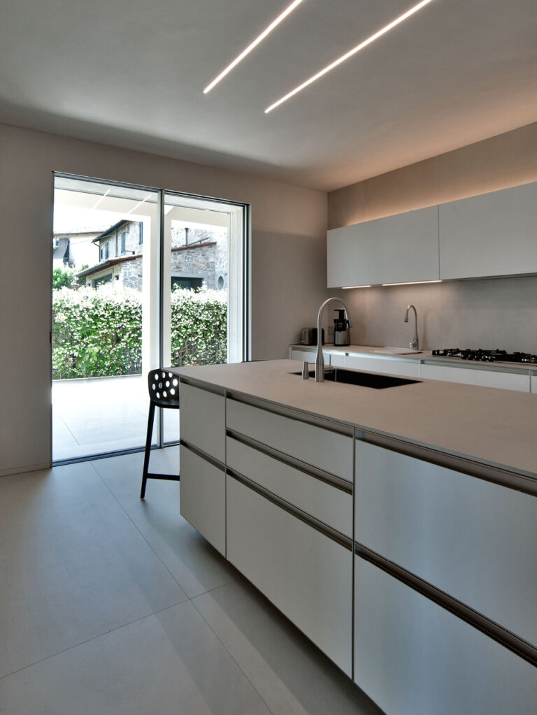 Inside,VBAA Studio has interpreted the Laminam total look by using delicate and subtle tones such as Avorio, selected from the Calce series and used for the internal flooring of the living area, crossing over to the exterior of the home, one’s attention drawn to the hilly landscape through the large window. Material and colour continuity that is also found in the sleeping area, on the stairs and along the halls, all the way to the kitchen where slabs are used as a countertop and top for the large central island, as well as in the bathrooms, for the flooring and shower base. The texture, inspired by industrial plasters and concretes, gives spaces to a refined and contemporary look, for a sense of well-being that conciliates the peace and liveability of spaces. For a harmonious colour contrast, the dark shades of the same Calce Nero series have been used for the flooring and cladding of another bathroom space, retaining the same hygienic properties offered by the perfectly natural material and almost total absence of joints. Ossido Bruno makes a real impact, used to clad the walls of the shower.