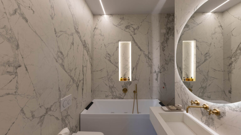 En el proyecto se han utilizado las colecciones I Naturali, Ossido y Calce, e IN-SIDE, en ocho acabados sabiamente integradas como pavimento, revestimiento o accesorios de decoración, en un diálogo perfecto con los materiales existentes, entre la reinterpretación y la tradición.