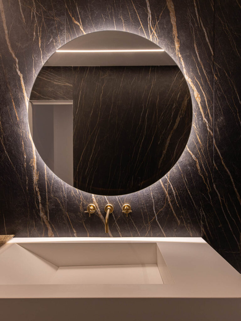 Palazzo BN es también la combinación perfecta de diseño y gusto. La barra ubicada en el Food Court utiliza la colección Ossido, elegida en el tono Bruno con espesor Laminam 5+ en el gran formato 1620×3240 mm: un material que, simulando el proceso de oxidación de las placas de cobre, captura las tonalidades iridiscentes del objeto metálico sujeto al paso del tiempo.